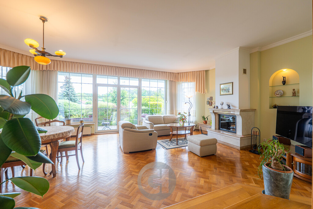 - przestronnego salonu z kominkiem, z obszernym oknem z widokiem na ogród i wyjściem na taras. Salon (42m2) stanowi serce tego domu. Położony jest 2 stopnie niżej niż pozostałe pomieszczenia, co dodatkowo podkreśla jego centralne położenie. W salonie mogą pozostać widoczne na zdjęciach meble - do uzgodnienia);