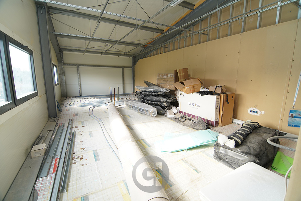 W części socjalnej, pomieszczenia jeszcze nie zostały wykończone, są wszystkie instalacje,ścianki działowe, ogrzewanie podłogowe. Zaplanowano salę, Wc, aneks kuchenny, pomieszczenie biurowe, szatnie.