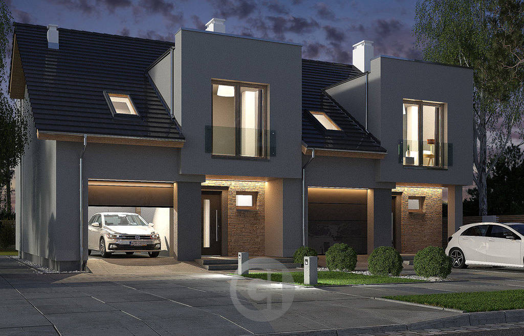 Cena obejmuje stan deweloperski budynku wraz z elewacją, przyłączeniem mediów do budynku oraz działkę i garaż.