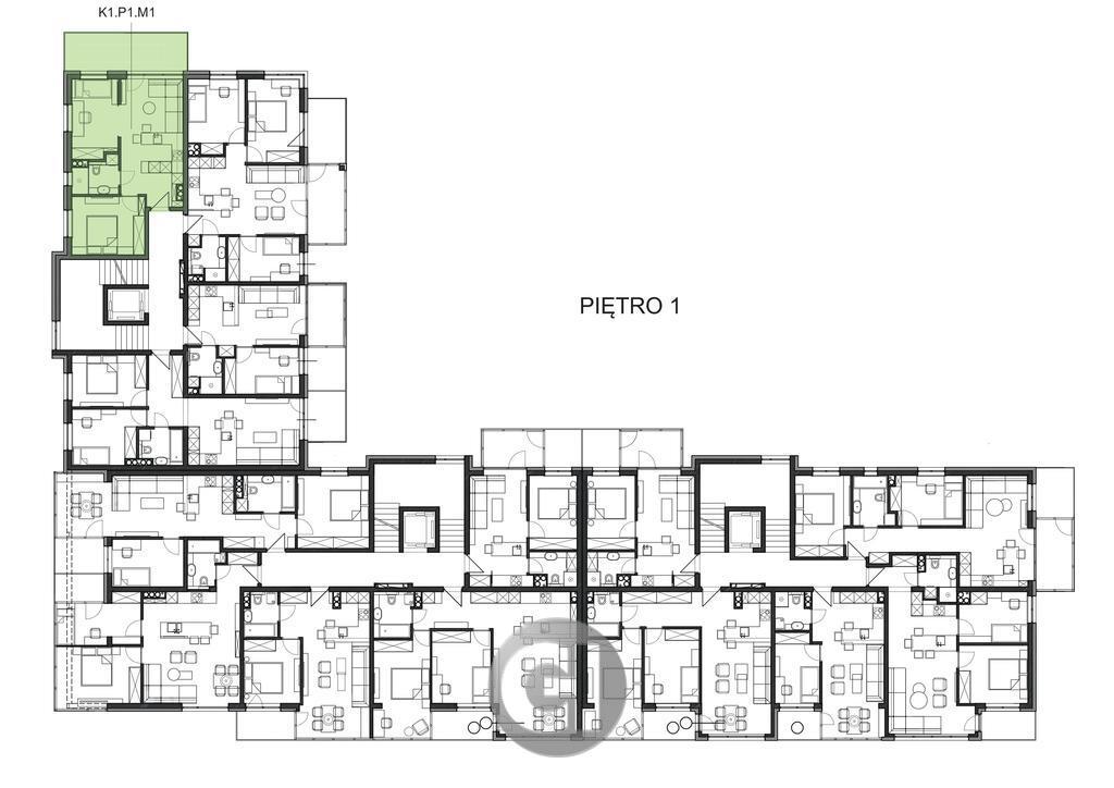 Mieszkanie w stanie deweloperskim o powierzchni użytkowej 45 m2, usytuowane na I piętrze budynku z windą, w budynku Park Wyszyńskiego.