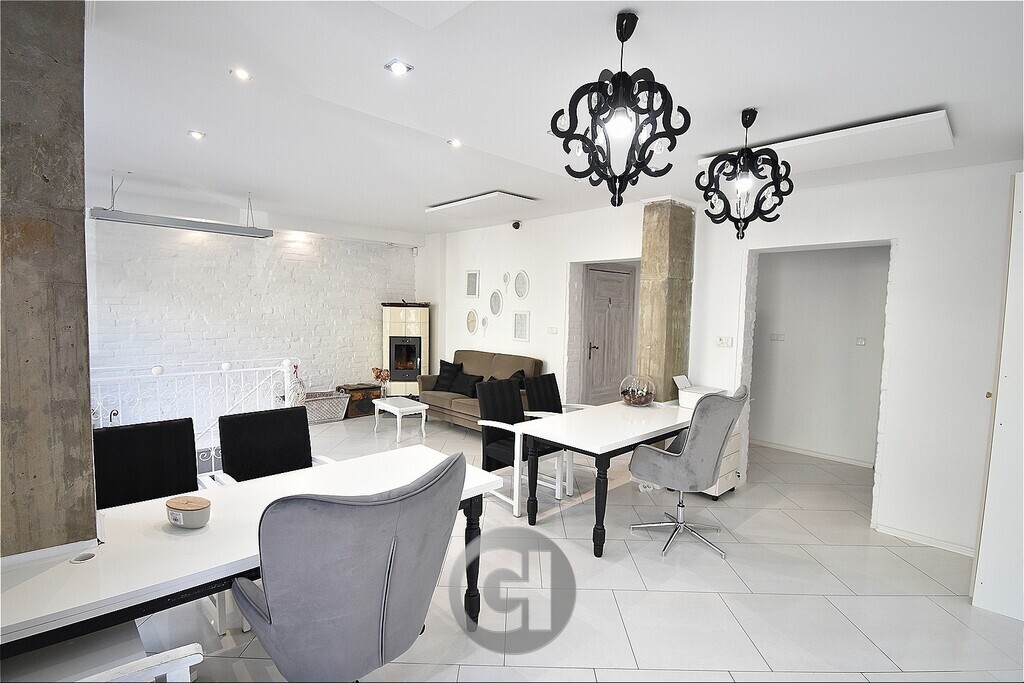 sali głównej, dwóch gabinetów, kuchni, osobnego WC, przynależna piwnica 18 m2.
