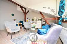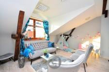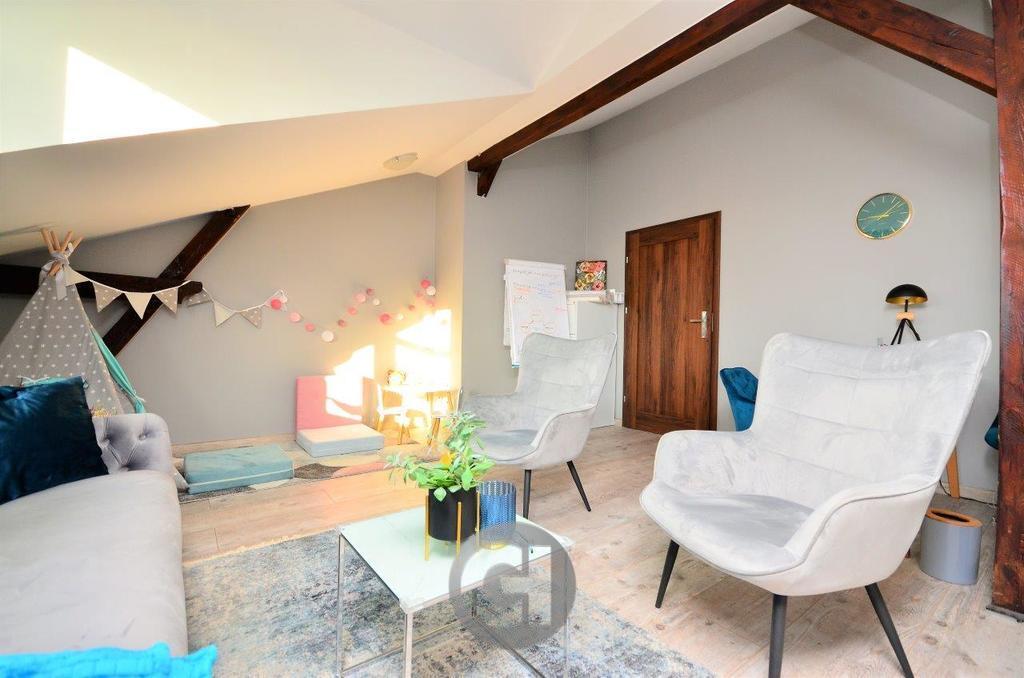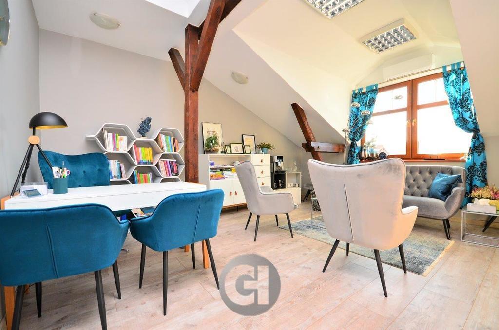 Wnętrze wyróżnia się unikalnym charakterem – duże okna zapewniają doskonałe doświetlenie, a drewniane belki sufitowe nadają przestrzeni wyjątkowy klimat.