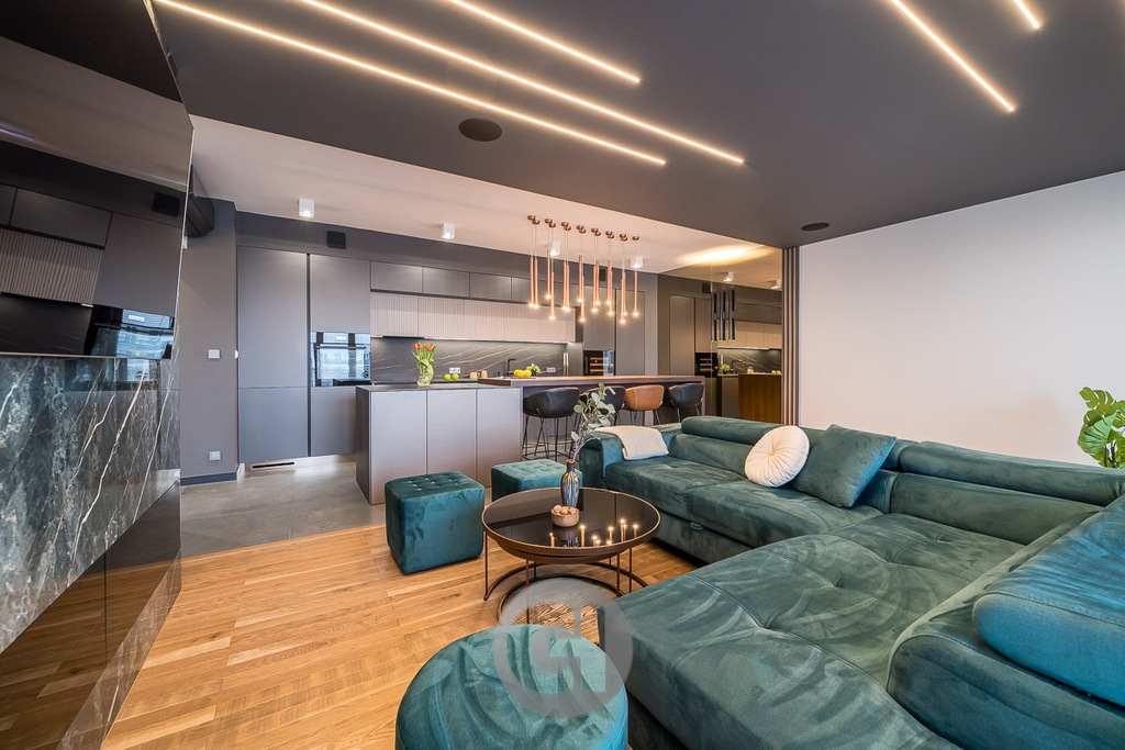 Zabudowy sufitowe i konstrukcje wykonano w sposób niestandardowy – z zastosowaniem dodatkowych wzmocnień, aby uniknąć pęknięć i zapewnić wieloletnią stabilność.