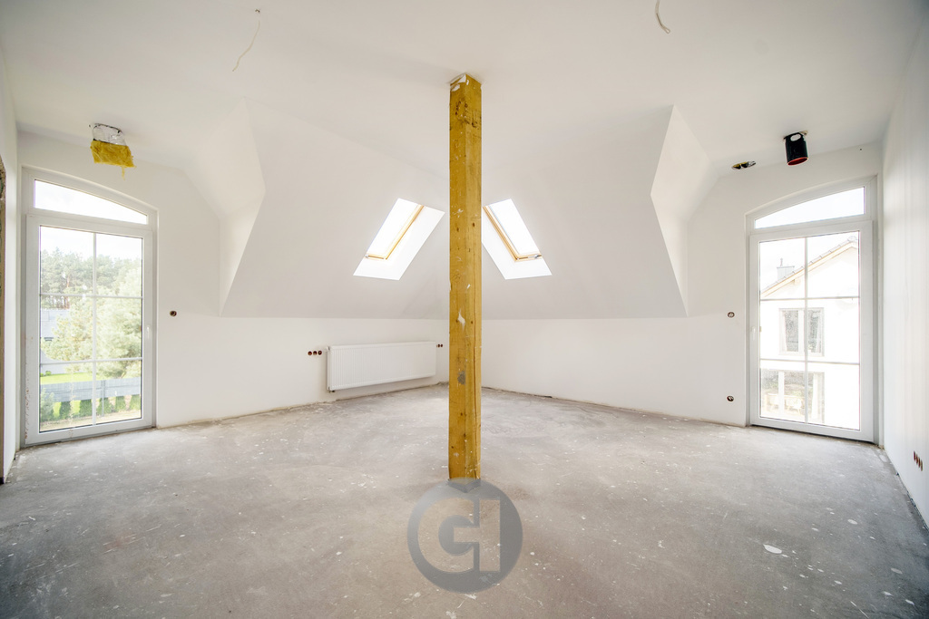 • Poddasze: cztery przestronne sypialnie (w tym jedna z prywatną łazienką), duży salon kąpielowy z potencjałem na domowe SPA oraz wygodny korytarz.