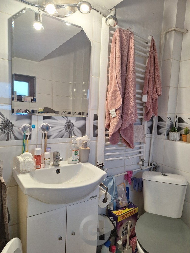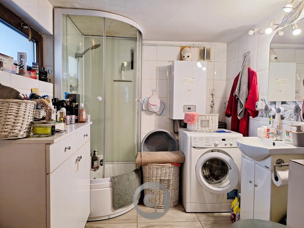 Łazienka wyposażona w kabinę prysznicową, umywalkę, toaletę oraz miejsce na pralkę, wykończona jasną glazurą.