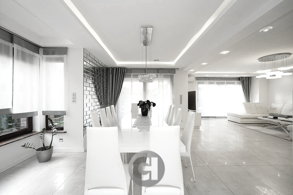 Całość dopełnia ogród zimowy o powierzchni 9 x 4 m – idealne miejsce na poranną kawę, odpoczynek po pracy czy spotkania z rodziną i przyjaciółmi.