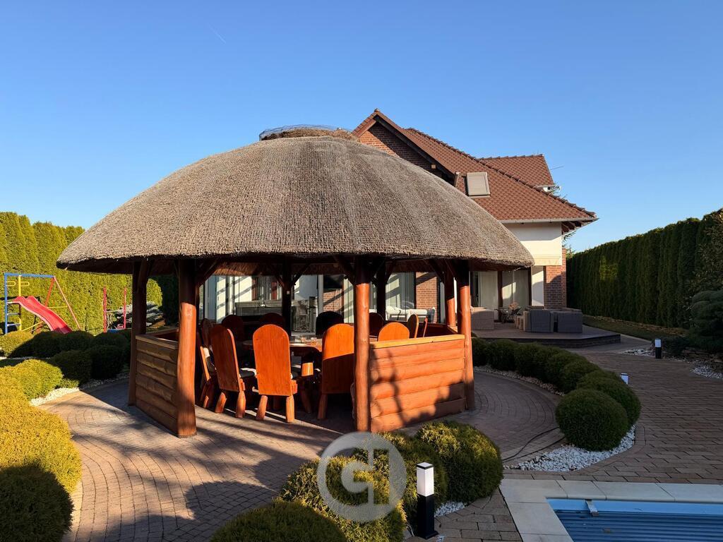 Dom o powierzchni 291 m², posadowiony na pięknie zagospodarowanej działce 15,6 ar, wybudowany w 2011 roku w technologii Porotherm, ocieplony 15 cm styropianu. Stropy oraz dach ocieplone wełną, dach pokryty ceramiczną dachówką karpiówką – trwałą, ponadczasową i cenioną za swoje właściwości izolacyjne.