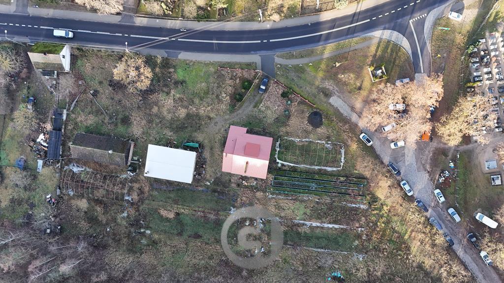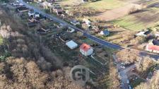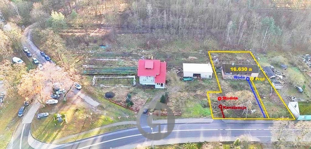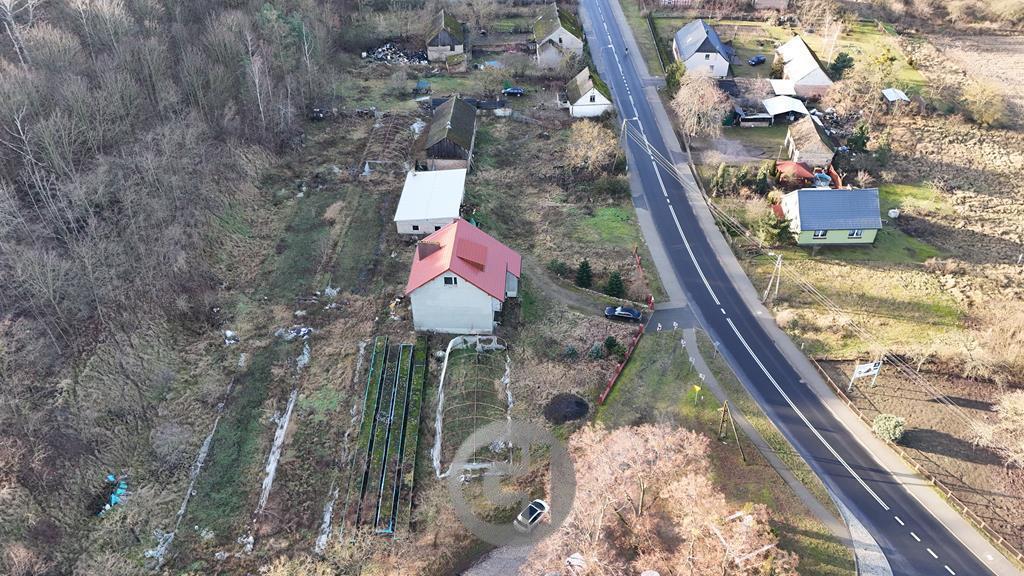 Istnieje możliwość podziału działki w części gdzie usadowiony jest budynek gospodarczy (zdjęcie przykładowego podziału), do którego doprowadzone jest już woda, prąd oraz kanalizacja.