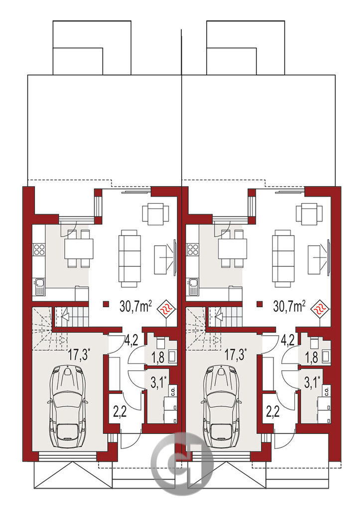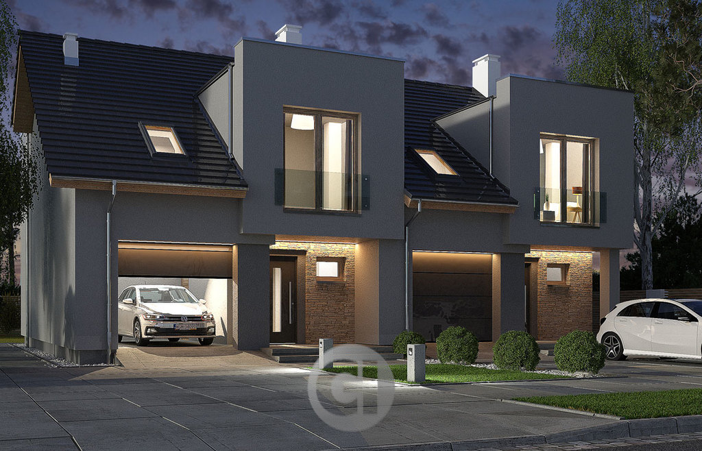 Cena obejmuje stan deweloperski budynku wraz z elewacją, przyłączeniem mediów do budynku oraz działkę i garaż.